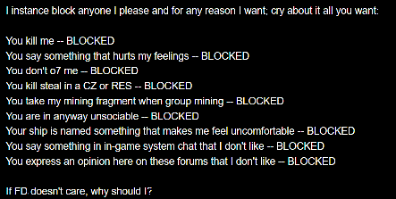 FDev has allowed players to block each other whenever they want and for whatever reason they want. As a result blocking is used as a punishment and is heavily abused. I have only been blocked once as far as I know and it was for not o7ing someone enough. That's absurd. Furthermore, whole squadrons of players get blocked by others because they interfere with their ability to freely do what they want. Some people on the forums have even admitted to blocking others for the ugly ship paint they chose, for disagreeing with them in the forums, for "kill stealing" in CZs and RES sites. Etc. The second image in this post lists actual reasons that people have admitted to as to why they blocked someone.